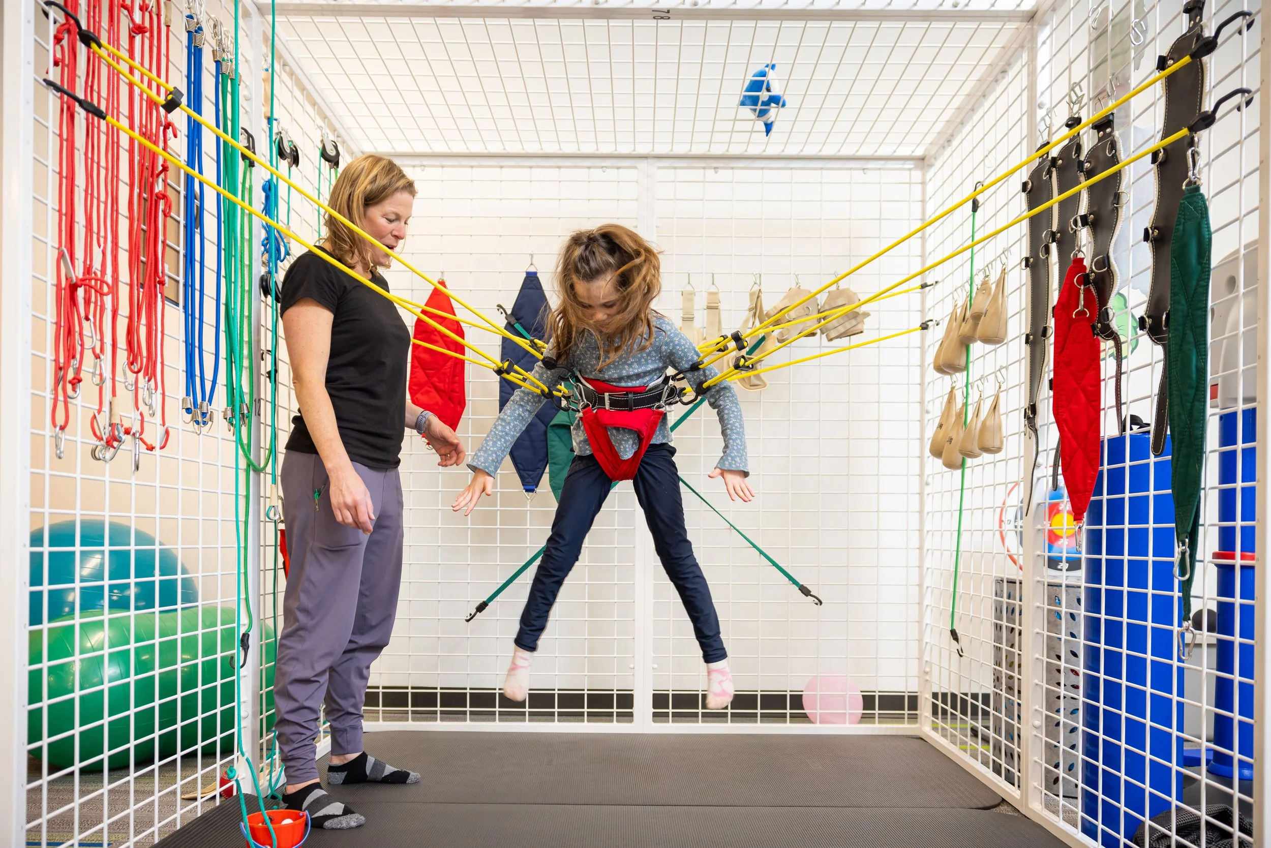 The spider cage as it is affectionately called, uses pulleys and bungees to support and challenge children as they practice movements. It helps build strength, balance, coordination, and confidence in a safe and adaptable way. We want to see your child reach milestones. Improvements in crawling, sitting, walking, even jumping - are all within reach with the help of the Universal Exercise Unit (UEU).
